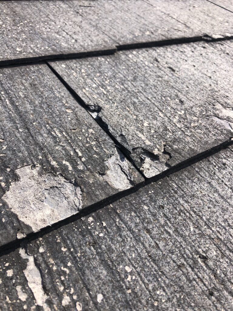 先日足場工事が完了し、まずは屋根工事です。25年ほど前のカラーベストですので相当傷んでおります。当時のカラーベストはアスベストが入っていない製品の最初の頃のもので中や表面が弾けてもろくなりやすいものが多かったようです。