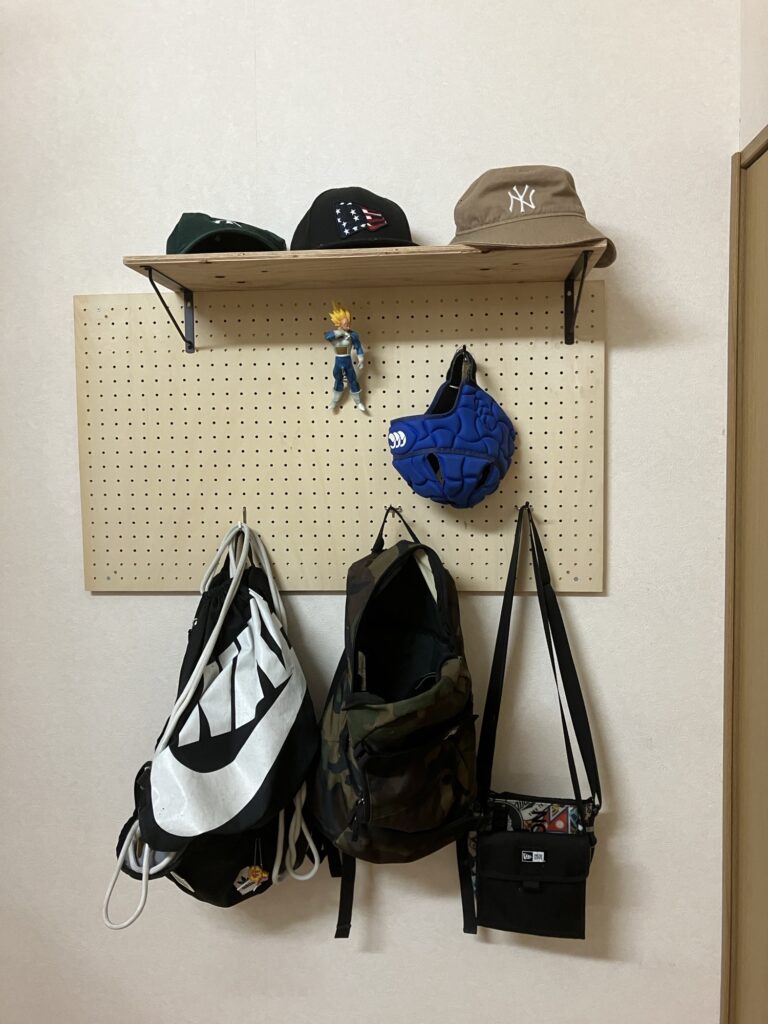 長男が一人暮らしをしている為現在は次男の独り占め部屋をバージョンアップしました。休日に次男とボチボチ製作です。有孔ベニヤを塗装してデスクの前に取り付け本棚とフィギュアも飾れるように小さな棚もつけました。エアプランツやプリント類も好きなところにつけれます。