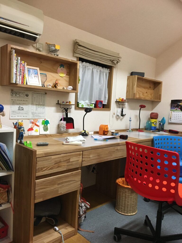 狭い部屋ですが部屋に合わせて作成しました。当時、完成した時は凄く喜んでくれましたが長男が大きくなると机を切って部屋も別にして欲しいとも言われました(涙) 切ろうかと考えもしましたが長男が一人暮らしをする事になったのでもう少し置いておきます。