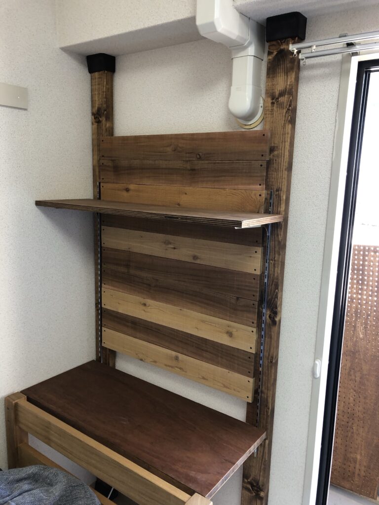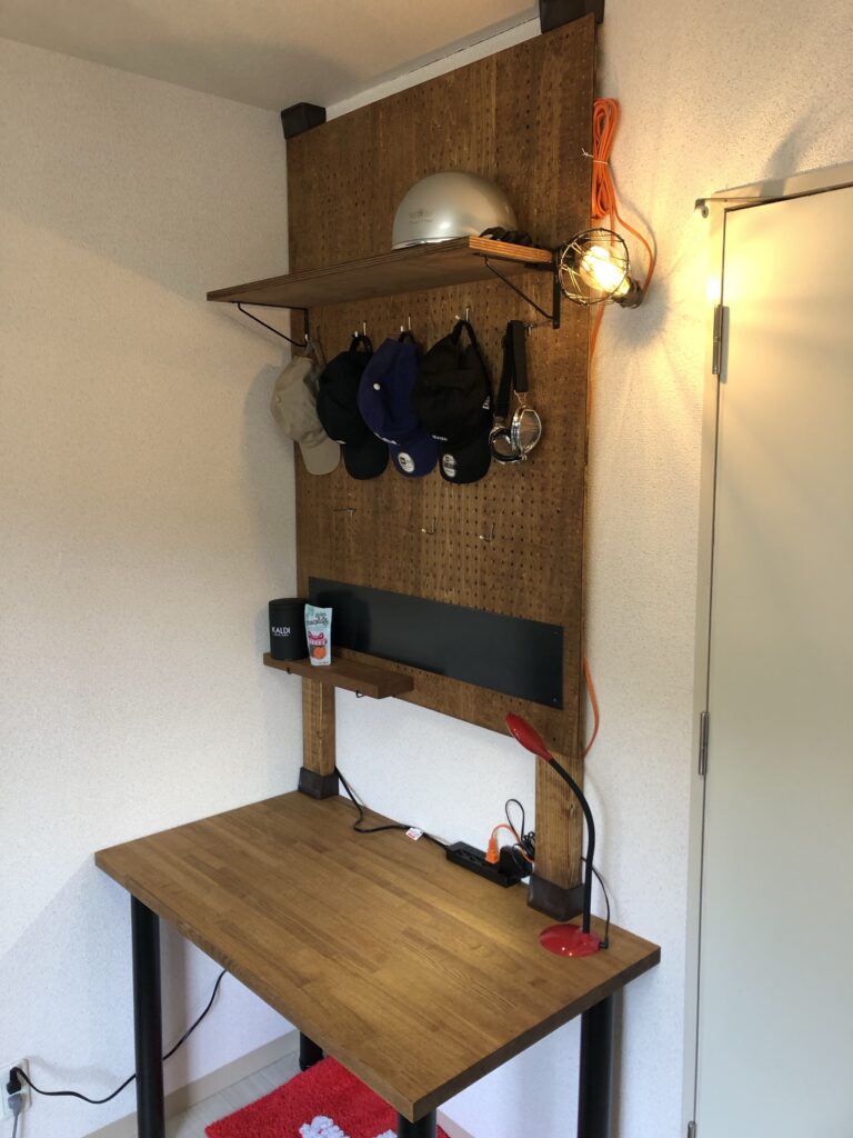 こちらが一人暮らし用の机です。こちらもタモのフリー版にチェスナット色を塗装してドア枠ギリギリまでで作成しました。 正面はディアウォール(2×4の突っ張り部材)に有孔ベニヤを貼り付けてます。IKEAの椅子だけ持ってきましたー。折角の一人暮らしなので楽しくオシャレに学生生活を送って欲しいなという思いです。6畳ワンルーム、しかし狭い(笑 どうしてやろうか仕事より考えてしまうのです。