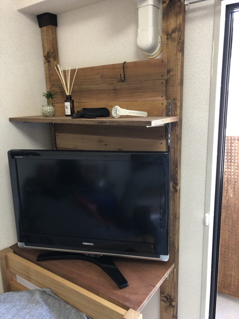TVをどこに置くのか悩んだ結果ベッドと壁の隙間に何とか入りました。ついでなのでTVの上に飾り棚を追加です。